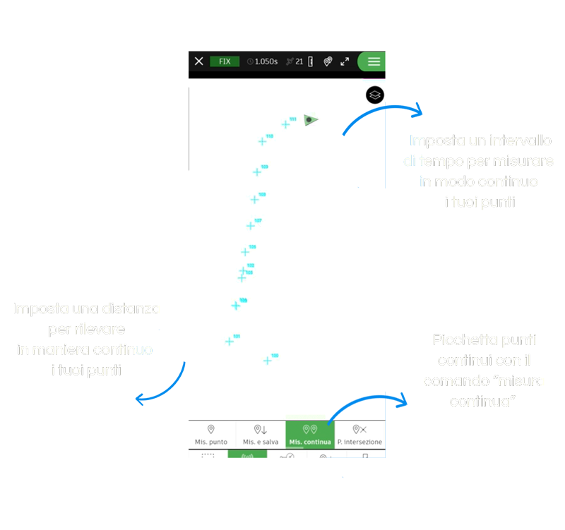 Nel rilievo continuo, dopo aver deciso se i punti dovranno essere presi ad intervalli di tempo o distanza, dovrai solo decidere quale mezzo utilizzare per spostarti lungo la zona oggetto del rilievo.